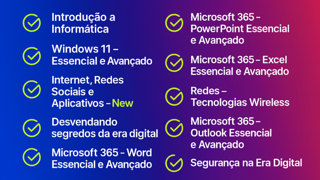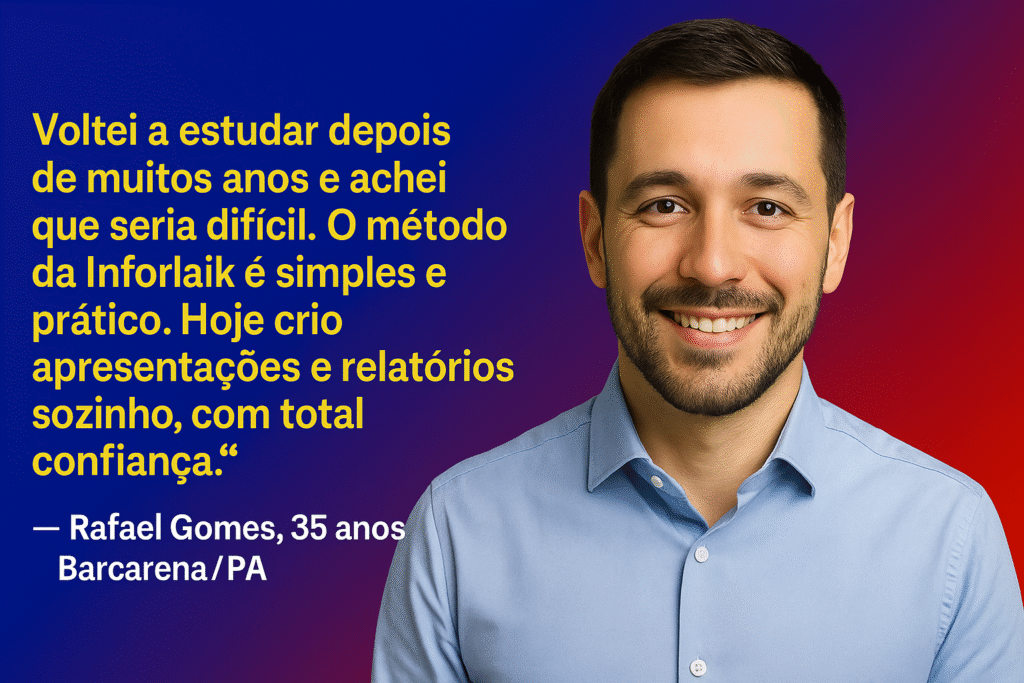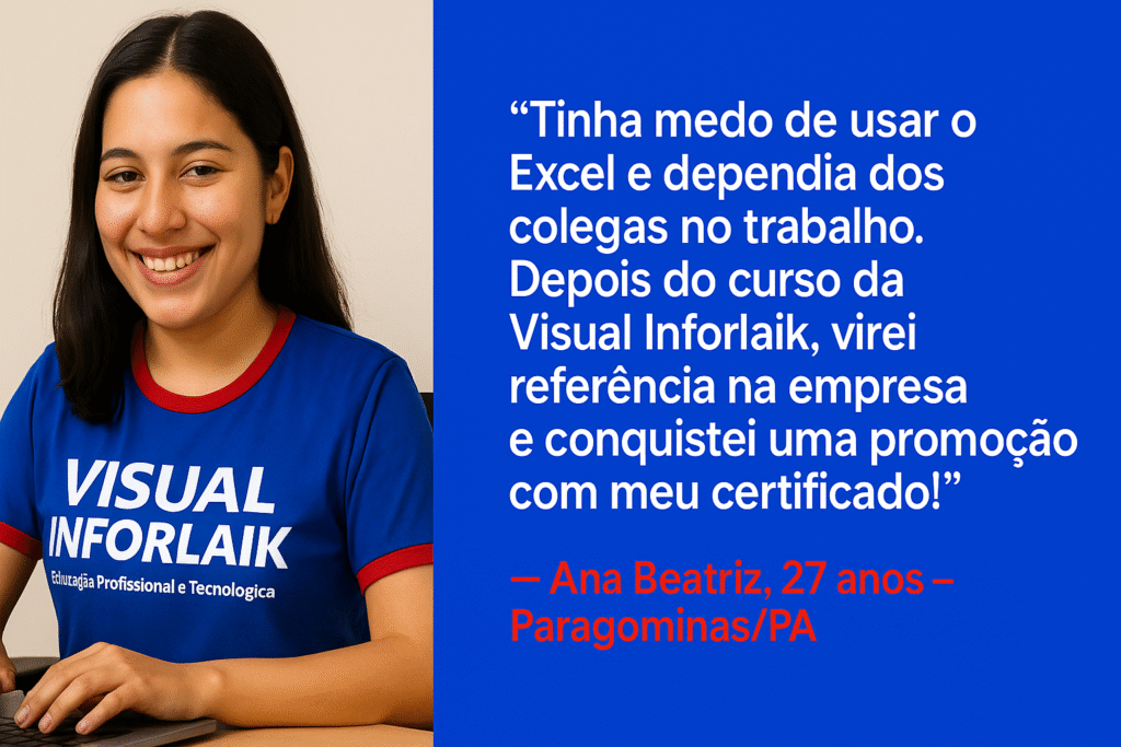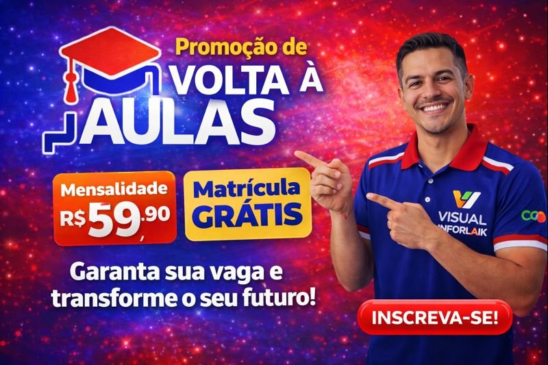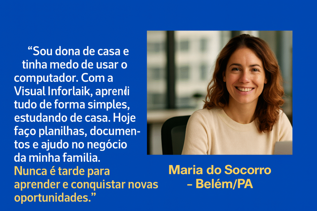 O Curso de Informática da Visual Inforlaik ensina você a dominar o computador do zero ao avançado, mesmo que nunca tenha usado antes. Com uma metodologia prática, dinâmica e 100% comprovada, você aprende passo a passo a usar os principais programas e ferramentas do mercado, criando apresentações, planilhas e documentos profissionais com total segurança e confiança. As aulas são presenciais ou online, com instrutores qualificados e suporte personalizado direto no seu computador e pelo WhatsApp. Ao concluir, você recebe um certificado reconhecido em todo o Brasil, valorizado por empresas e instituições de ensino. Mais do que um curso, é a sua porta de entrada para o mercado de trabalho, autonomia digital e novas oportunidades de crescimento profissional.